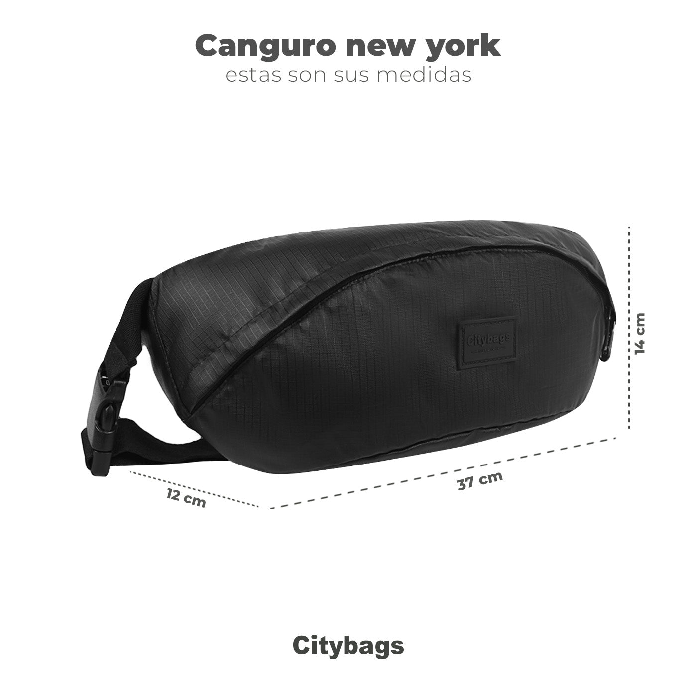 Dimensiones compactas: 37 cm x 14 cm x 12 cm — espacio suficiente para llevar lo esencial sin estorbar.