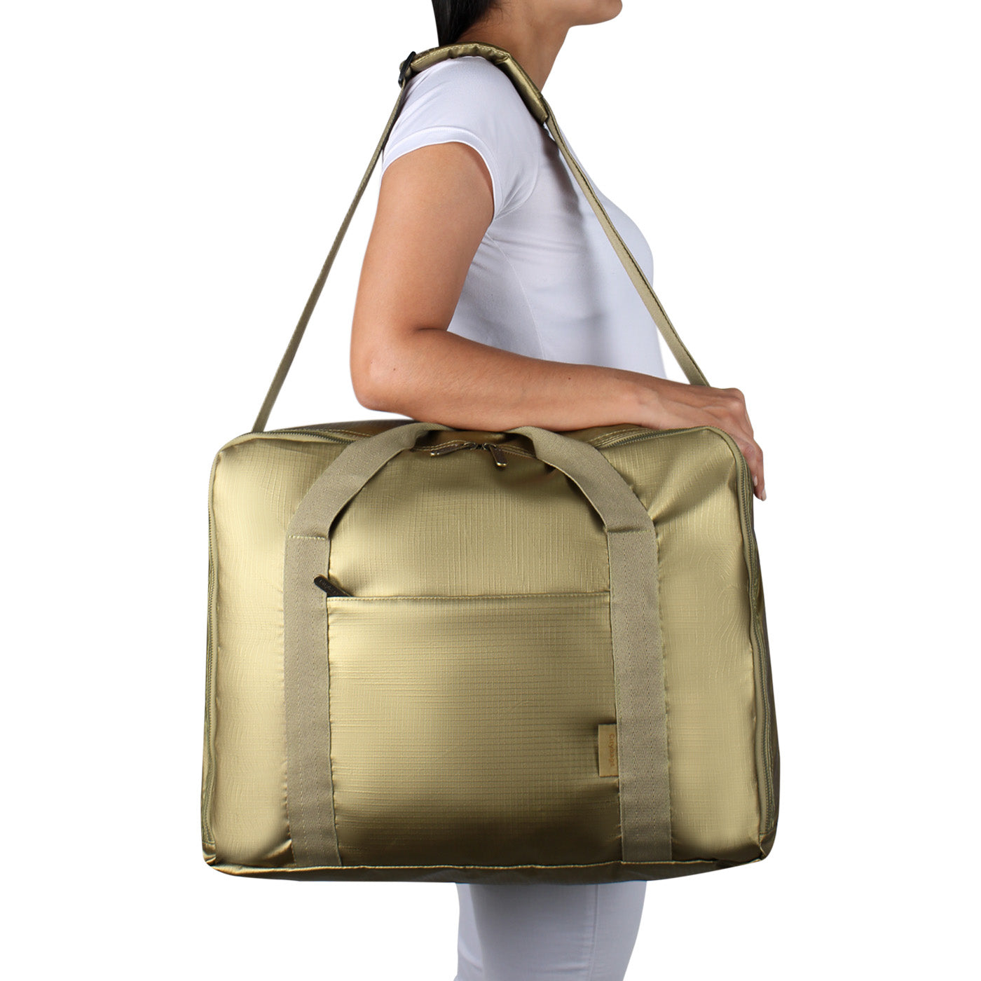 Con medidas abierta de 43cm x 35cm x 19cm  tiene una capacidad de 28 litros y es fácil de doblar y guardar. Puedes colocarla en tu maleta de ruedas o llevarla al hombro. Úsala como equipaje de mano o como artículo personal en las aerolíneas low cost.