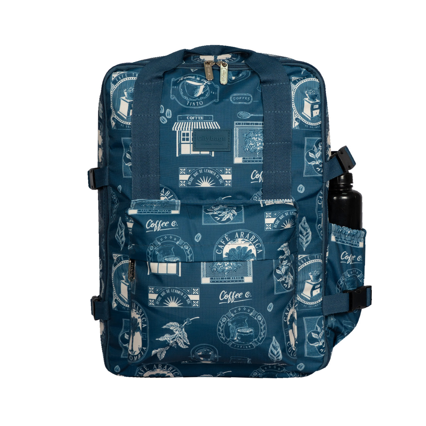 Diseño funcional y seguro: Compartimento principal con apertura en U y doble deslizador para un acceso cómodo. Incluye bolsillo frontal con cremallera, compartimento lateral para termo .