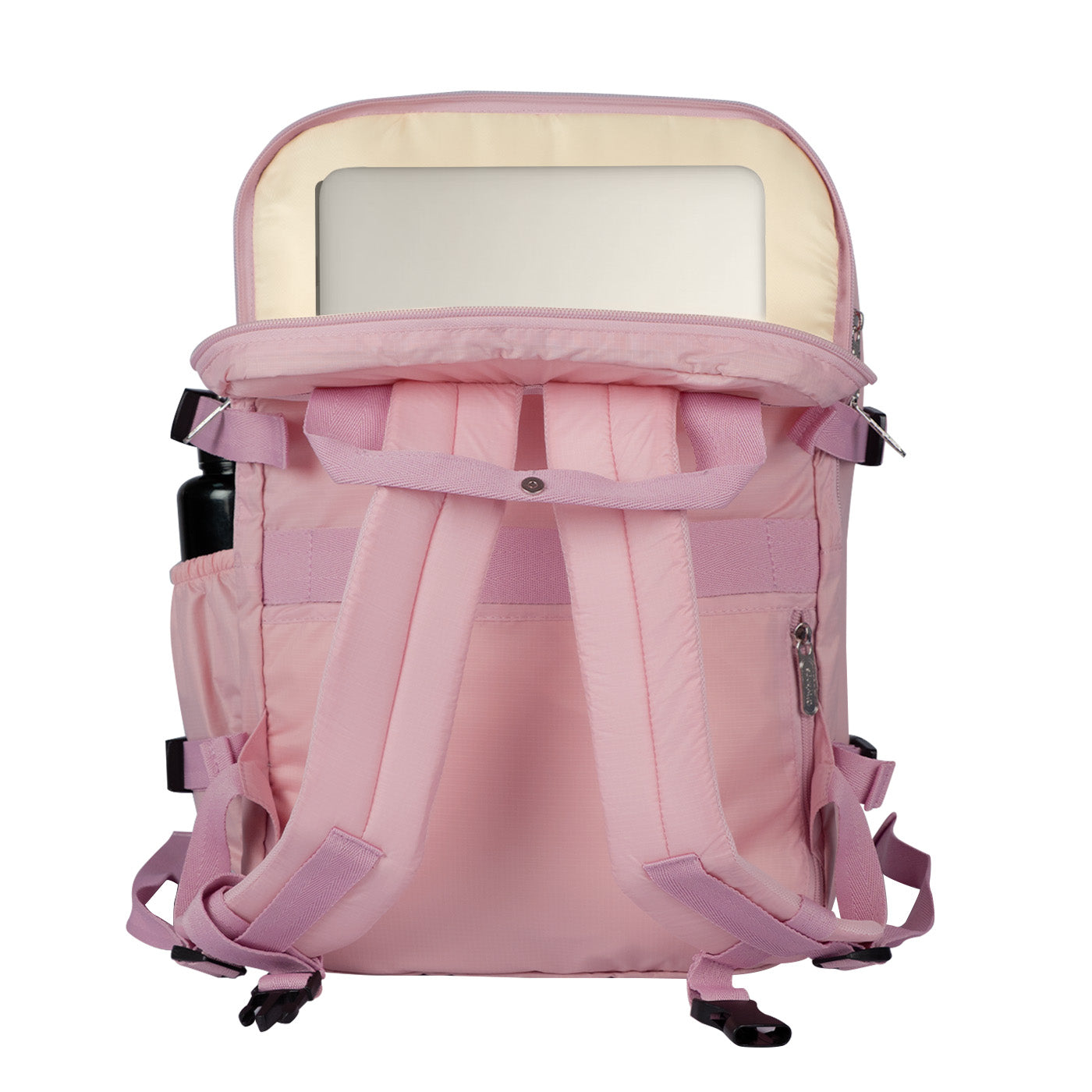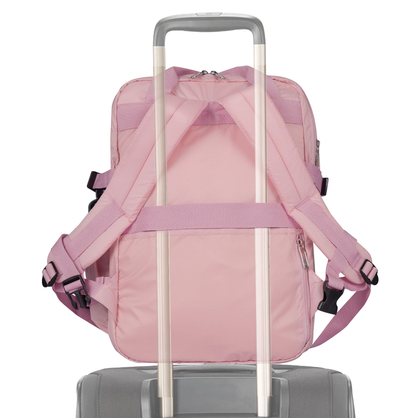 Ergonomía y confort: Cargaderas acolchadas y ajustables, espaldar con espuma para mayor comodidad, y correa trasera para sujetar al carry-on.