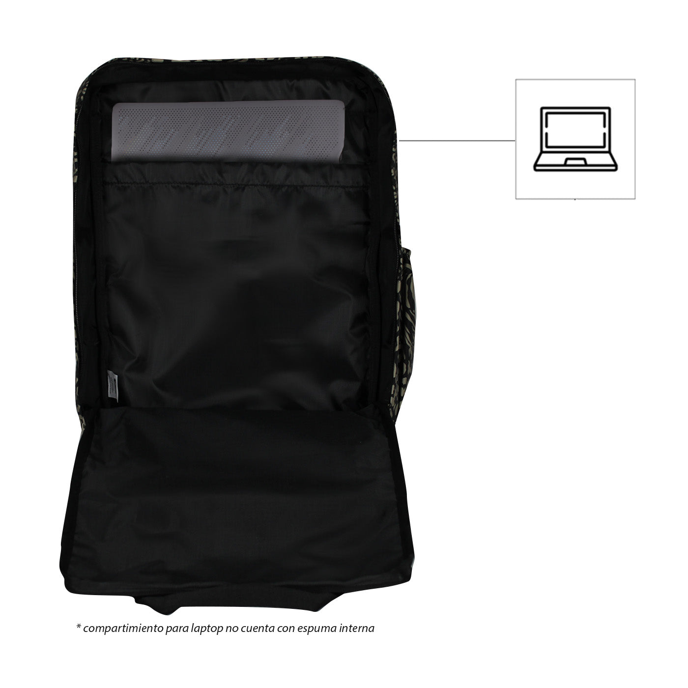 Diseño funcional: El morral cuenta con un compartimiento principal con doble deslizador y apertura en U, que permite un fácil acceso a tus pertenencias. Además, tiene múltiples bolsillos, incluyendo uno frontal con cremallera, un lateral para tu termo y un bolsillo trasero con cremallera para laptop de hasta 15".